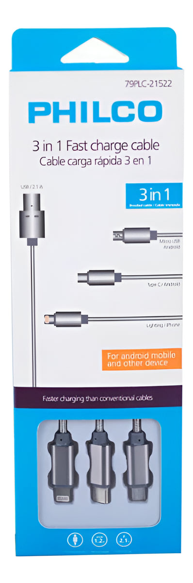 Cable Carga Rápida 3 En 1 Micro Usb iPhone Tipo C Philco
