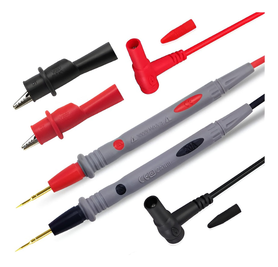 Set de cables de prueba para multímetro, diseñados para medir voltaje, corriente y resistencia. Tienen puntas de aguja afiladas para una medición precisa y están aislados para proteger al usuario de descargas eléctricas. Soportan un voltaje máximo de hasta 1000V.