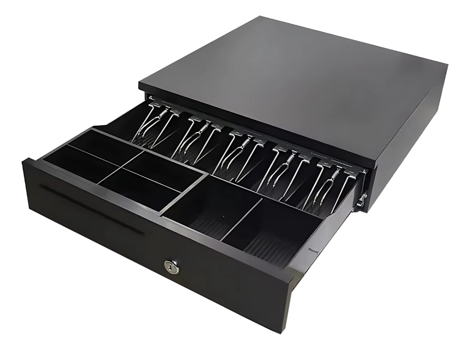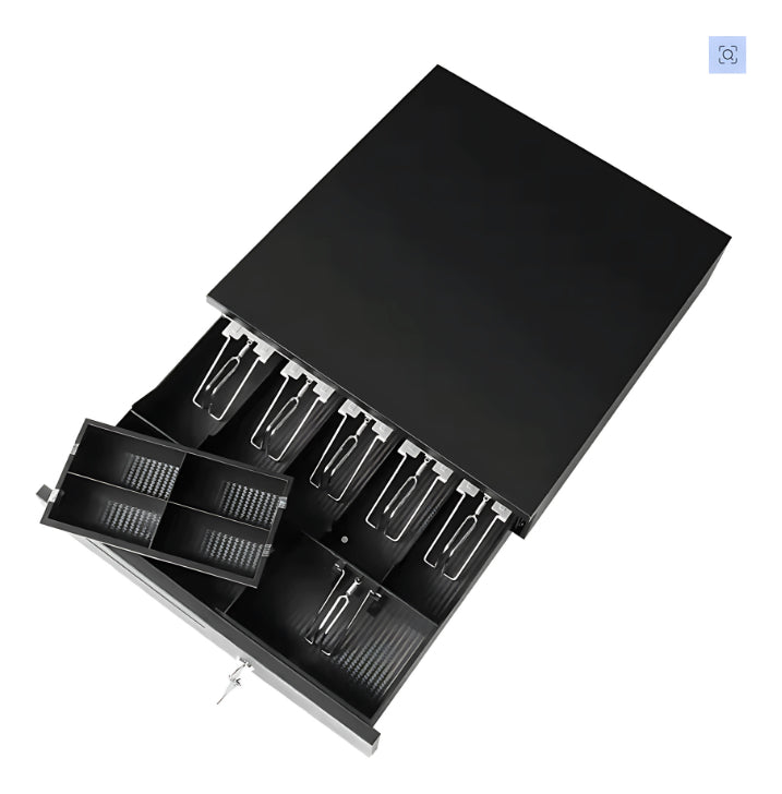 Una caja de seguridad metálica para el almacenamiento de dinero en efectivo. Cuenta con una gaveta registradoras con compartimentos para billetes y monedas, lo que facilita la organización y el conteo del dinero. El diseño de la caja es compacto y robusto, lo que la hace ideal para su uso en puntos de venta, oficinas, comercios y otros negocios. Es una solución segura y confiable para guardar el dinero de forma segura. Con unas dimensiones de 42 cm de largo, 40 cm de ancho y 10 cm de alto, es ideal para el uso diario en el hogar o en la oficina.