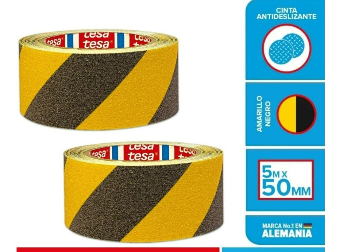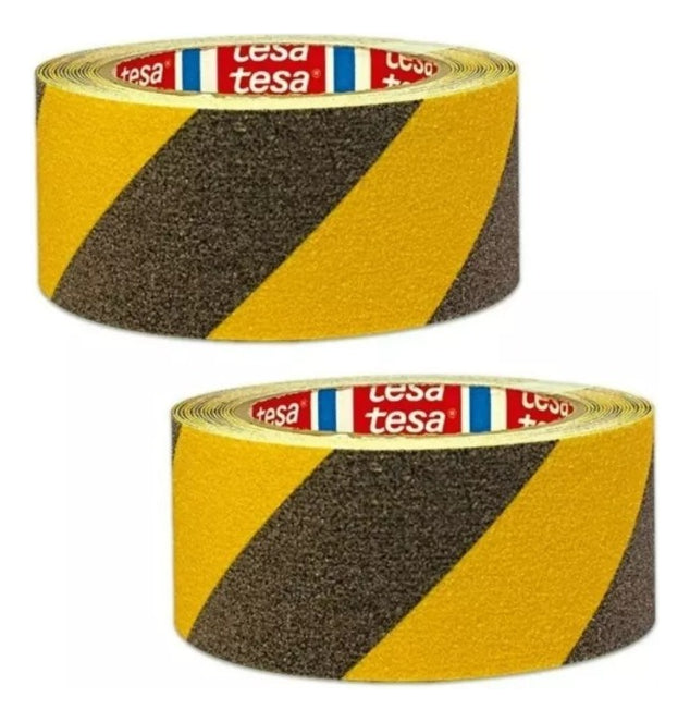 Pack x 2 Cintas Antideslizantes Tesa Negra/Amarilla 15m x 50mm. Pack de 2 rollos de cinta antideslizante de alta calidad Tesa, esencial para la seguridad en el hogar, el trabajo o áreas industriales. Cada rollo tiene 15 metros de largo y 50 mm de ancho, con una superficie rugosa que proporciona tracción máxima. El diseño en franjas negras y amarillas asegura una alta visibilidad y sirve como advertencia de peligro. Ideal para aplicar en escaleras, rampas, pisos resbaladizos, entradas y cualquier superficie que requiera prevención de caídas. Es resistente a los rayos UV, al agua y a la intemperie. ¡La solución profesional para evitar accidentes y marcar zonas de riesgo!
